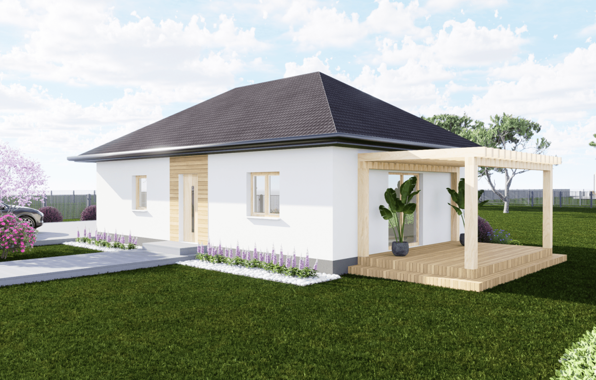 Opis Przytulny domek składający się z otwartego salonu z kuchnią oraz 3 sypialni. Wejście do kotłowni z wiatrołapu. Koszt wykonania do stanu deweloperskiego wraz z fundamentem (przy prostych warunkach gruntowych) na podstawie standardów wykonania NaszDomek.eu to 419 000 zł brutto.
